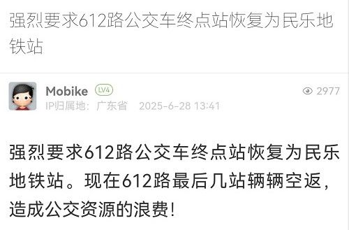 19. 帖文《強烈要求612路公交車終點站恢復(fù)為民樂地鐵站》
