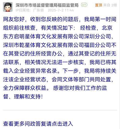 網(wǎng)友您好,收到您反映的問題后,我局第一時間組織前往核查,有關(guān)情況如下: 經(jīng)檢查,北京東方啟明星體育文化發(fā)展有限公司深圳分公司、深圳市乾星體育文化發(fā)展有限公司福田分公司不在其登記的住所經(jīng)營辦公,通過其登記的住所無法聯(lián)系,相關(guān)情況無法進一步核實,我局已將其載入企業(yè)經(jīng)營異常名錄。下一步,我局將持續(xù)關(guān)注該企業(yè)經(jīng)營狀態(tài),會同文體等部門共同處置,全力保障群眾權(quán)益。 感謝您對我們工作的監(jiān)督、理解和支持!