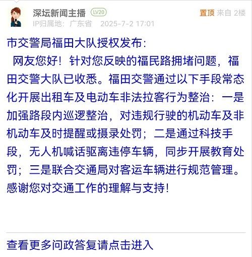 網(wǎng)友您好!針對您反映的福民路擁堵問題,福田交警大隊已收悉。福田交警通過以下手段常態(tài)化開展出租車及電動車非法拉客行為整治:一是加強路段內(nèi)巡邏整治,對違規(guī)行駛的機動車及非機動車及時提醒或攝錄處罰;二是通過科技手段,無人機喊話驅(qū)離違停車輛,同步開展教育處罰;三是聯(lián)合交通局對客運車輛進行規(guī)范管理。感謝您對交通工作的理解與支持!