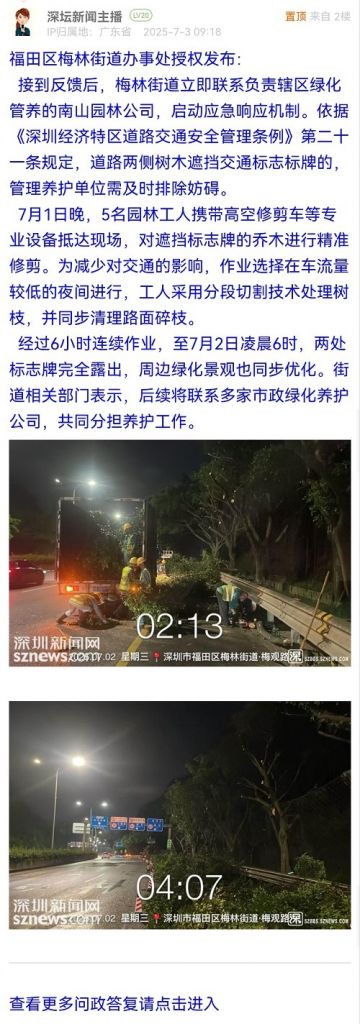 接到反饋后,梅林街道立即聯(lián)系負(fù)責(zé)轄區(qū)綠化管養(yǎng)的南山園林公司,啟動應(yīng)急響應(yīng)機制。依據(jù)《深圳經(jīng)濟特區(qū)道路交通安全管理條例》第二十一條規(guī)定,道路兩側(cè)樹木遮擋交通標(biāo)志標(biāo)牌的,管理養(yǎng)護單位需及時排除妨礙。