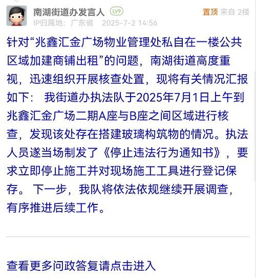 針對“兆鑫匯金廣場物業(yè)管理處私自在一樓公共區(qū)域加建商鋪出租”的問題,南湖街道高度重視,迅速組織開展核查處置,現(xiàn)將有關(guān)情況匯報如下: 我街道辦執(zhí)法隊于2025年7月1日上午到兆鑫匯金廣場二期A座與B座之間區(qū)域進行核查,發(fā)現(xiàn)該處存在搭建玻璃構(gòu)筑物的情況。執(zhí)法人員遂當(dāng)場制發(fā)了《停止違法行為通知書》,要求立即停止施工并對現(xiàn)場施工工具進行登記保存。 下一步,我隊將依法依規(guī)繼續(xù)開展調(diào)查,有序推進后續(xù)工作。