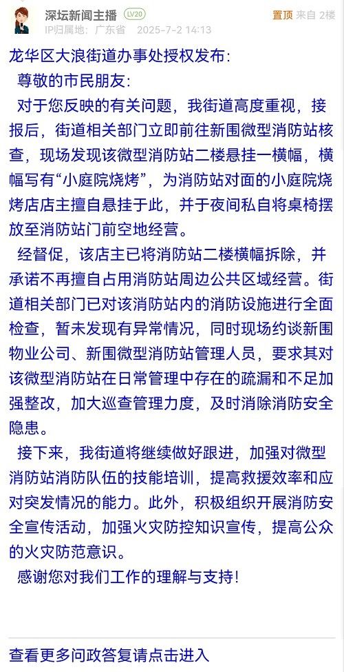對于您反映的有關(guān)問題,我街道高度重視,接報后,街道相關(guān)部門立即前往新圍微型消防站核查,現(xiàn)場發(fā)現(xiàn)該微型消防站二樓懸掛一橫幅,橫幅寫有“小庭院燒烤”,為消防站對面的小庭院燒烤店店主擅自懸掛于此,并于夜間私自將桌椅擺放至消防站門前空地經(jīng)營。