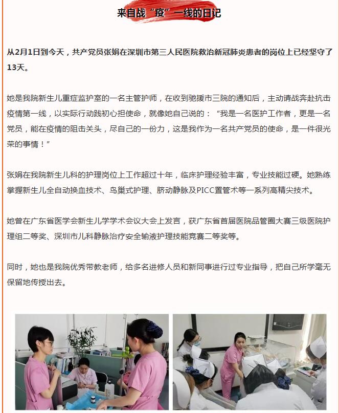 賴碧娟是深圳市婦幼保健院急診黨支部書記、急診科護士長。作為一名老黨員,抱著“疫情快些得到控制,最大程度減少損失”的信念,新冠肺炎疫情期間,她帶頭沖在一線,整個春節(jié)期間基本都在醫(yī)院加班。[詳細(xì)]